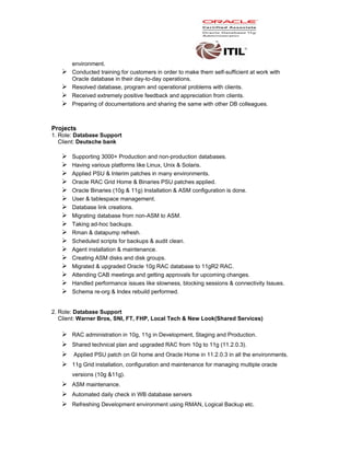 Abhishek Gadamsetti is an Oracle DBA with over 3 years of experience administering Oracle databases on UNIX, Linux, and Windows platforms. He has expertise in database installation, configuration, maintenance, performance management, backup and recovery strategies. His experience includes migrating databases, implementing database designs, and resolving issues for clients like Deutsche Bank, Warner Bros, and ICICI Lombard. Currently he works as an Oracle Database Administrator at Hewlett Packard Enterprise, where he supports over 3000 production and non-production databases across various platforms.