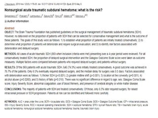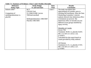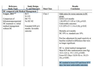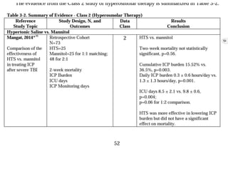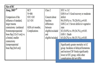 This document summarizes guidelines from the Brain Trauma Foundation (BTF) for the management of traumatic brain injury (TBI). It provides indications and recommendations for surgery on various brain injuries like epidural hematomas, subdural hematomas, and depressed skull fractures based on factors like volume and Glasgow Coma Scale. It also outlines Level I-III evidence for treatments, monitoring thresholds, and recommendations regarding intracranial pressure, cerebral perfusion pressure, seizures and other topics.