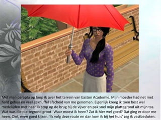 Met mijn parapluop loop ik over het terrein van Easton Academie. Mijn moeder had net met hard gehuil en veel geknuffel afscheid van me genomen. Eigenlijk kreeg ik toen best wel medelijden met haar. Ik stop op de brug bij de vijver en pak snel mijn plattegrond uit mijn tas. Wat was die plattegrond groot! Waar moest ik heen? Zat ik hier wel goed? Dat ging er door me heen. Oké, even goed kijken. ‘Ik volg deze route en dan kom ik bij het huis’ zeg ik vastbesloten.