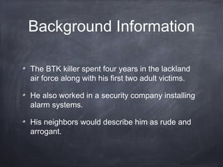 The document provides background information on Dennis Rader, known as the BTK killer. It describes that Rader spent time in the air force where he committed his first two murders. He later worked in security and was described as rude and arrogant. Rader admitted developing early fantasies of bondage and tying up girls. He committed his first family murders by killing Joseph and Julie Otero and their two children. In total, Rader committed 10 murders and was sentenced to 175 years in prison for his crimes when he was arrested in 2005.