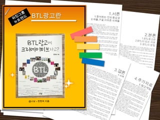 - BTL은 소비자의 생활 속에 광고를 노출시켜 놓고 소비자가 체험을 통해 스스로 느끼도록 하는 것