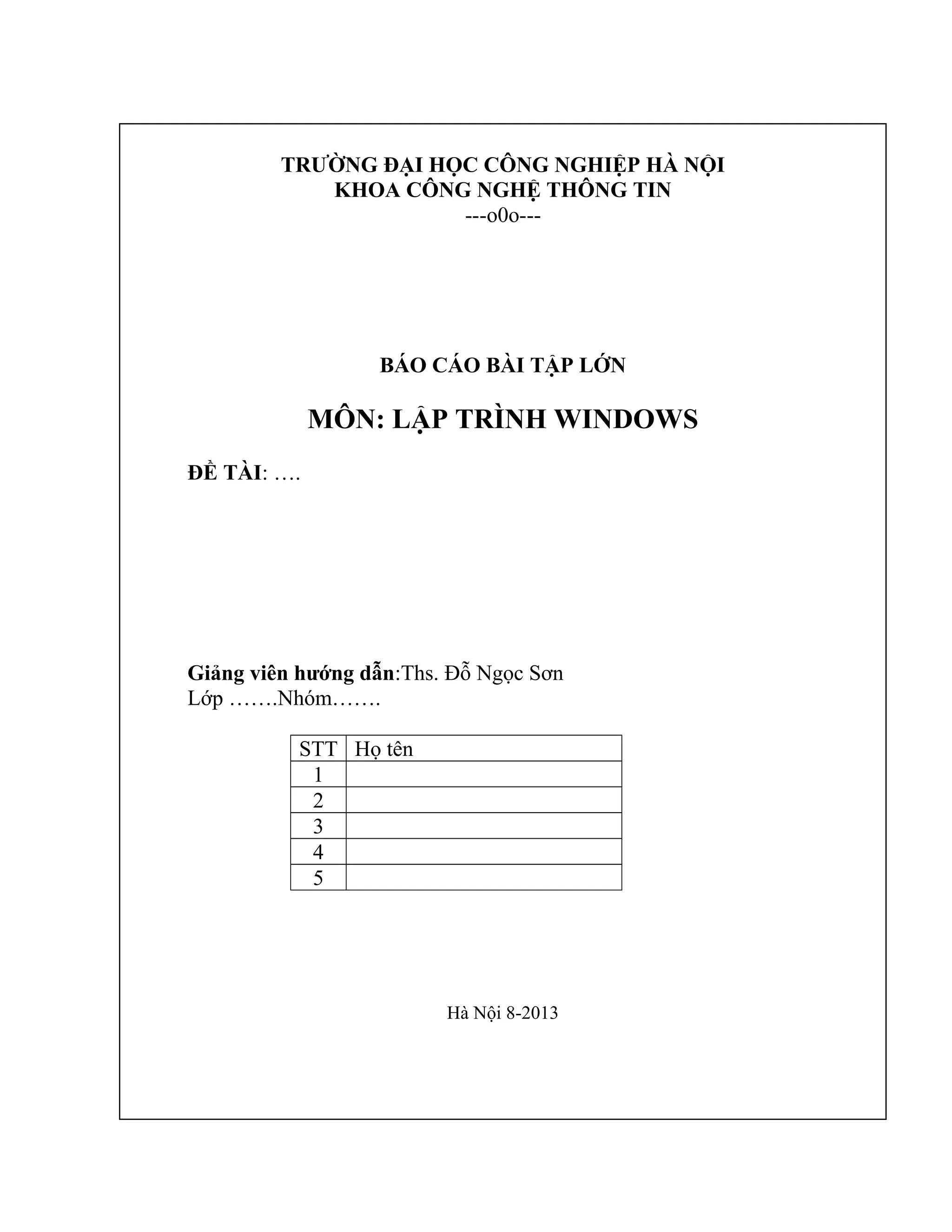 Bài tập lớn môn lập trình windows yêu cầu sinh viên hệ thống hóa kiến thức và xây dựng ứng dụng thực tế theo nhóm tối đa 3 người. Mỗi nhóm sẽ khảo sát, phân tích thiết kế hệ thống, lập báo cáo, và bảo vệ bài tập lớn để lấy điểm thi kết thúc học phần. Nội dung báo cáo cần nêu rõ phân công công việc, cài đặt trong SQL Server, thiết kế chương trình và kết luận.