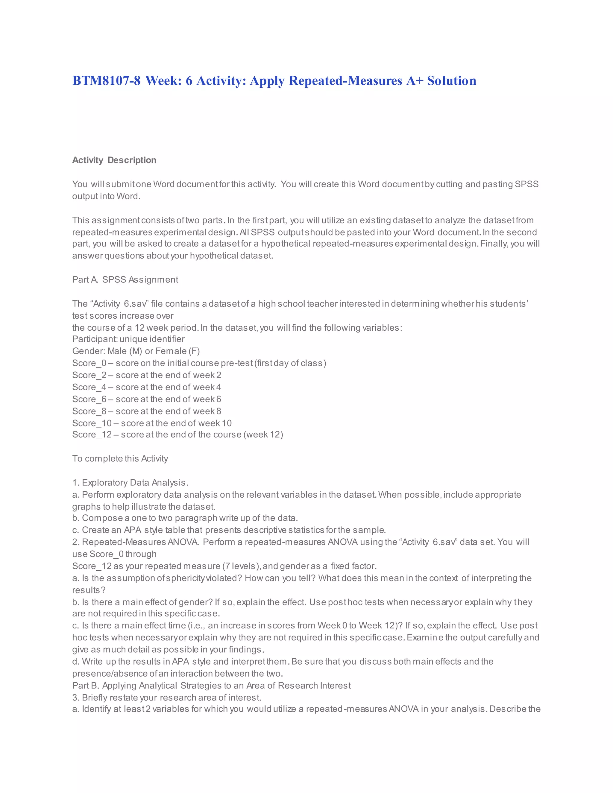 This document provides instructions for an assignment analyzing a repeated measures experimental design using SPSS. Students are asked to: