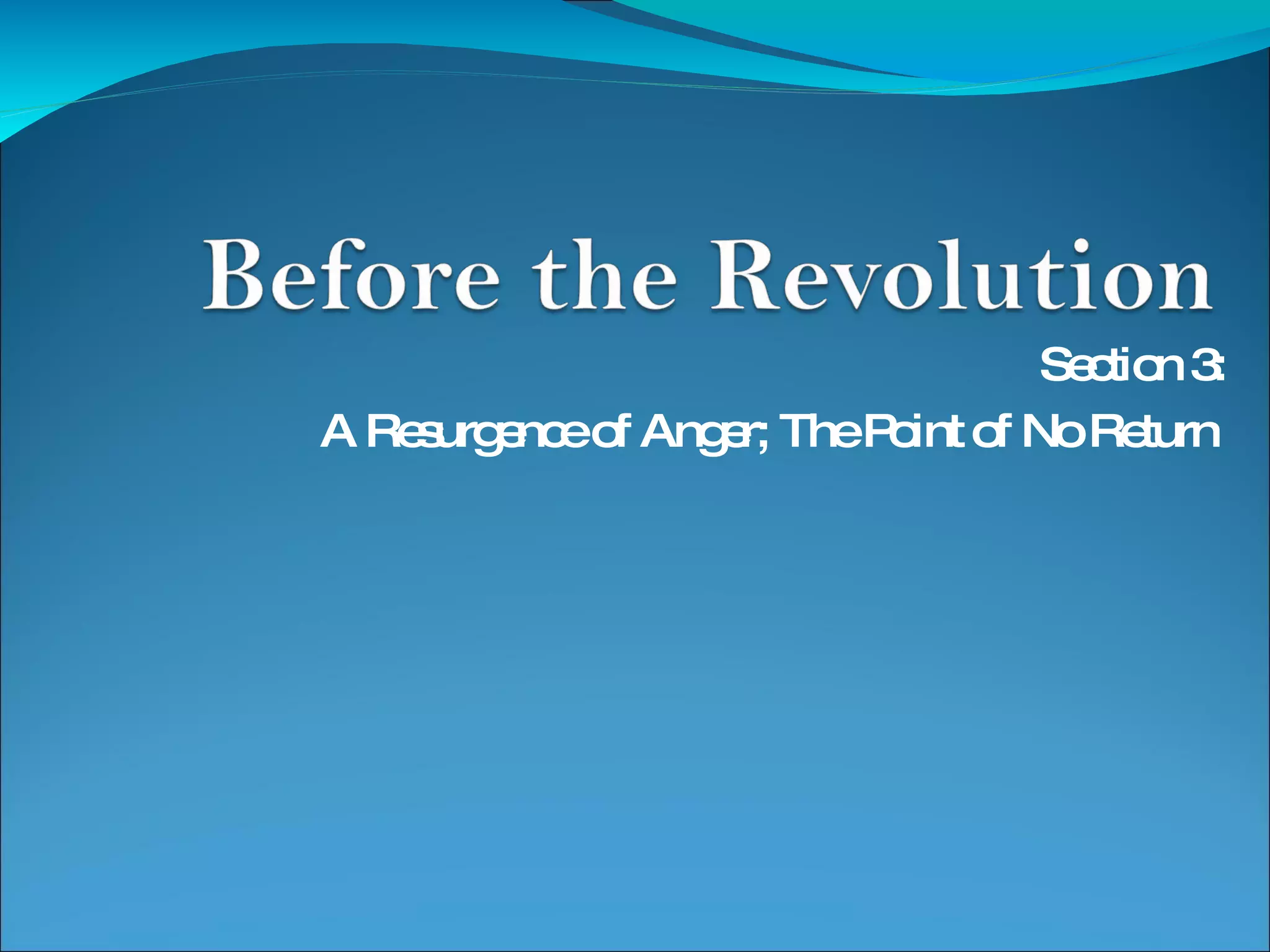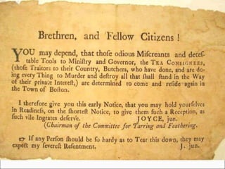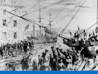 The document summarizes rising tensions between the British colonies in America and Britain in the 1770s. It describes several key events that increased tensions, including the Boston Massacre trial, the burning of a British ship in Rhode Island, and the Boston Tea Party. In response to the Tea Party, Britain passed the Intolerable Acts to assert control over the colonies and closed Boston harbor. This led colonists to form the first Continental Congress to coordinate resistance and consider independence from Britain.