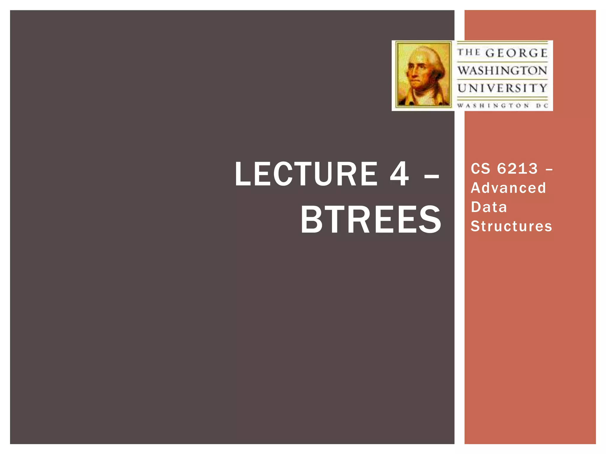 This lecture discusses B-trees, a data structure optimized for disk access that addresses limitations of traditional binary trees by keeping keys balanced across nodes. Key properties include limitations on the number of child nodes and keys per node, ensuring all leaves are at the same level, and emphasizing efficient insertions and deletions. B-trees allow for high utilization of disk space and effective access patterns, making them ideal for large datasets exceeding RAM capacities.