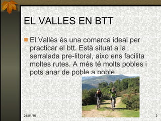 EL VALLES ENBTT El Vallès és una comarca ideal per practicar el btt. Està situat a la serralada pre-litoral, aixo ens facilita moltes rutes. A més té molts pobles i pots anar de poble a poble.