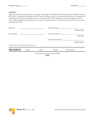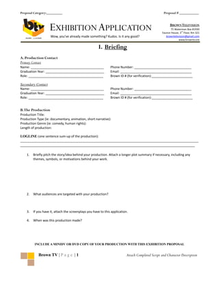 This document is an application for exhibiting a production on Brown Television (BTV). It requests information about the primary and secondary production contacts, including their names, contact details, graduation years, roles, and Brown IDs. It also asks for details about the production such as the title, type, genre, length, logline, target audiences, and when it was made. The applicant agrees to allow BTV full rights to exhibit and use the production for promotional purposes if accepted. Space is provided for BTV staff decisions and signatures. The application requests a mini DV or DVD copy of the production be included.