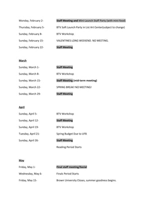 This document provides the tentative schedule and events for the Brown Television (BTV) staff for the spring 2009 semester. It outlines the dates for staff meetings roughly every two Sundays to keep the whole staff updated. BTV workshops are also scheduled some weekends for certain departments to work on projects. The schedule then lists the specific dates in January through May for staff meetings, programming hell days, a soft launch party, workshops, and other key events for the semester.