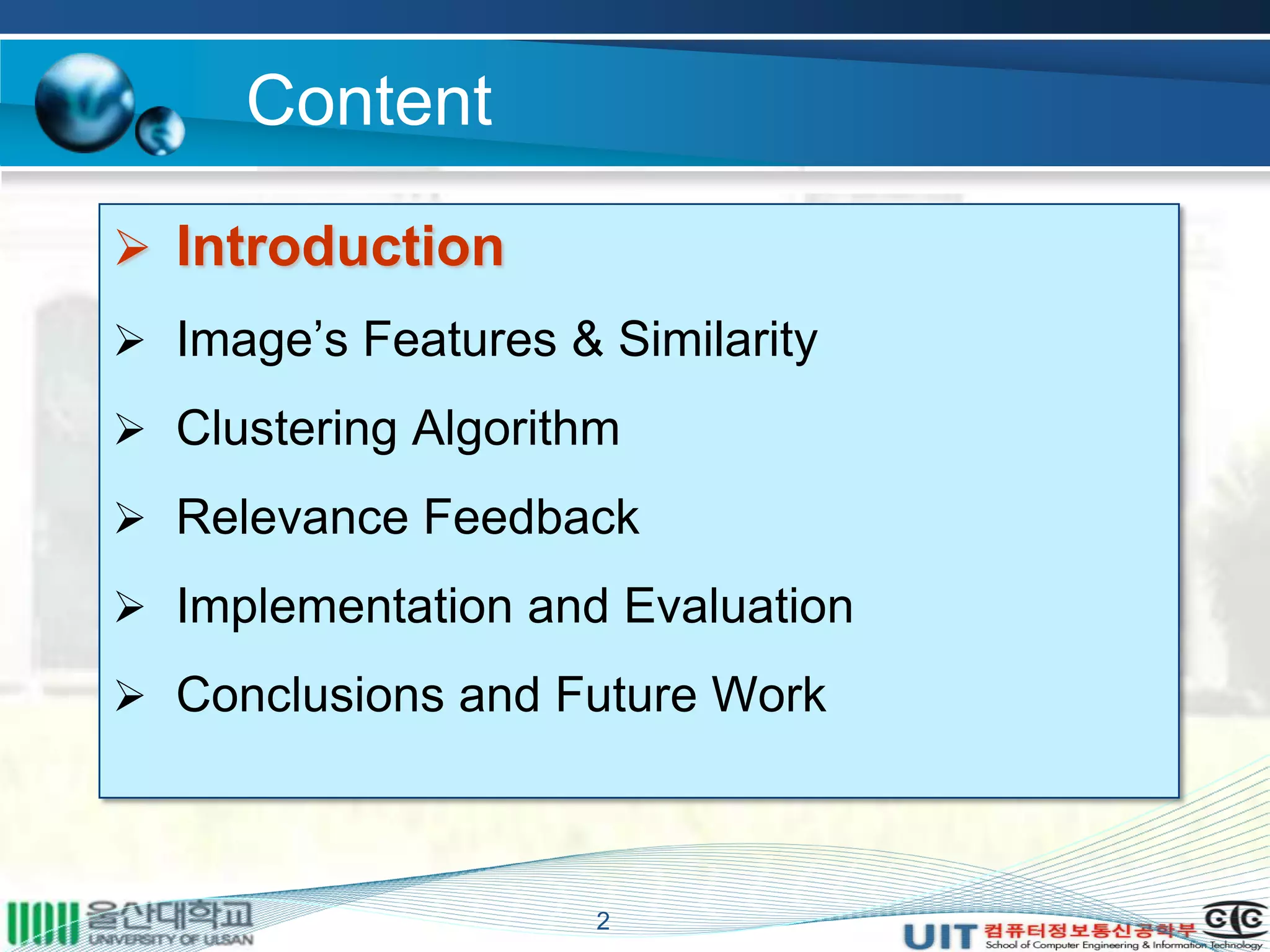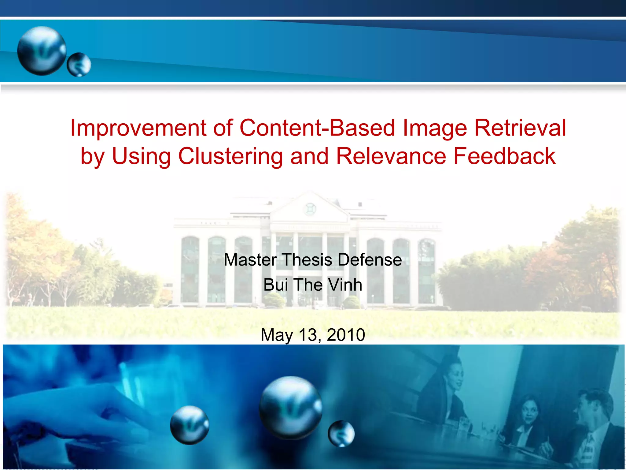 The document summarizes a master's thesis that proposed improvements to content-based image retrieval systems through clustering and relevance feedback. It describes extracting image features, measuring similarity, clustering images using k-means, obtaining user feedback to reformulate queries, and using support vector machines for relevance feedback. The implementation clustered a database of 9918 images, showed improved search times with clustering, and increased accuracy through iterative relevance feedback. The thesis demonstrated a complete content-based image retrieval system with enhanced performance.