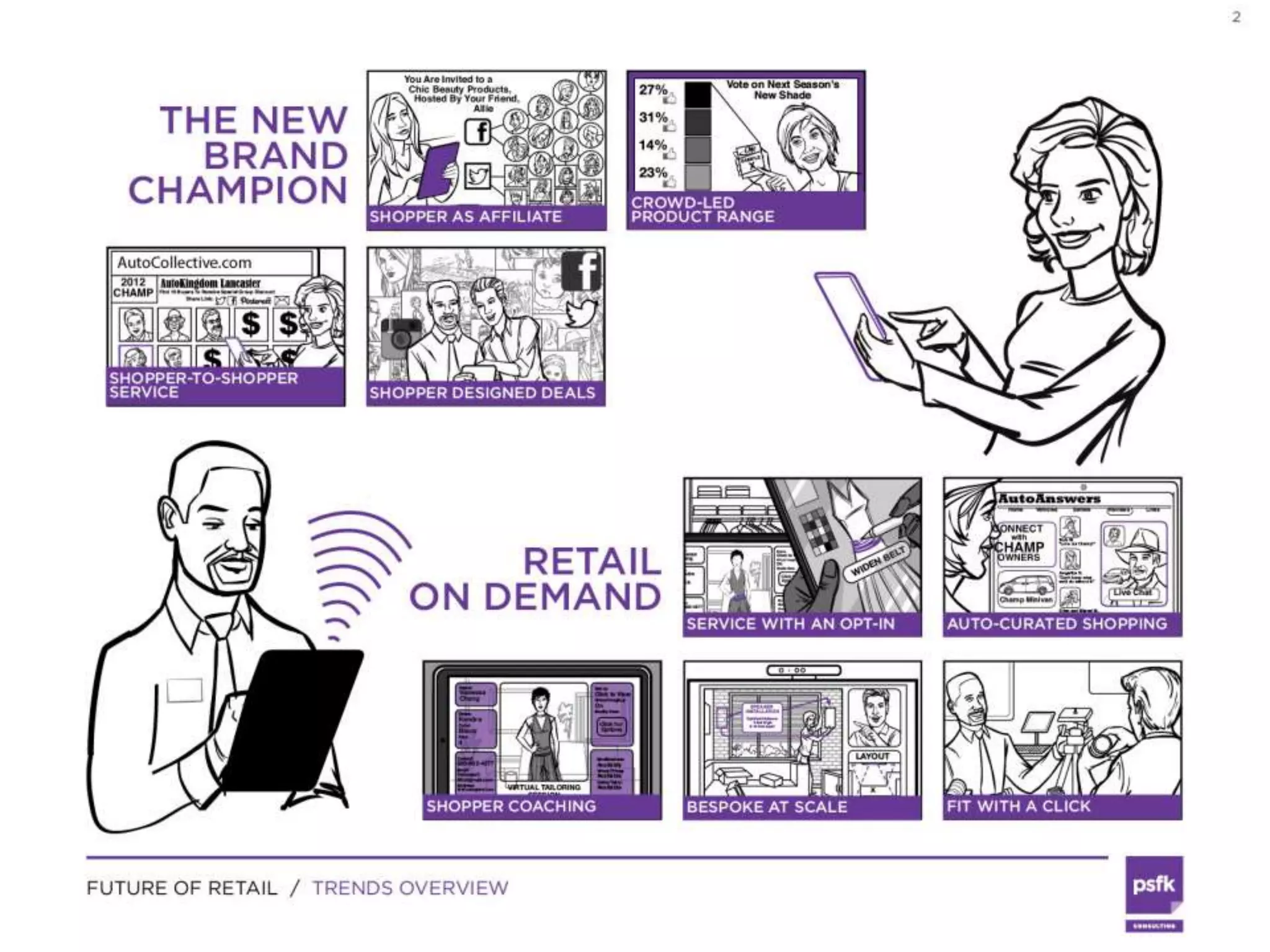 The document discusses the evolving landscape of retail emphasizing the shift towards personalized, on-demand experiences for modern shoppers who expect tailored interactions and value exchange for their data. It highlights innovative strategies like adaptive pricing, augmented reality, and community-driven services that empower customers to engage with brands and products more interactively. The document underscores the importance of effective marketing communications that adapt to this new, two-way dialogue between brands and consumers.