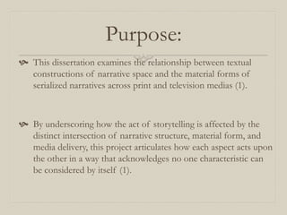 This dissertation examines how narrative space is constructed in serialized print and television works across four case studies: the Victorian serial Mysteries of London, the Newgate novel Jack Sheppard, the television adaptations of Bleak House and Little Dorrit, and the television show Lost. Through these case studies, the dissertation analyzes how narrative space relates to serialization, material form, and cooperative fan practices of reconstruction. The key findings are that narrative space is destabilized by serialization, illustrations and text shape interpretations of each other, character movement constructs agency, and fan practices continuously reconfigure narrative space.