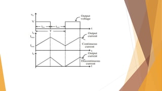 This document discusses different types of DC-DC converters, specifically focusing on buck converters. It describes how buck converters work by using a switch to chop the input voltage and an inductor and capacitor to provide steady output voltage. The duty cycle of the switch controls the output voltage. Buck converters can operate in continuous or discontinuous conduction mode depending on the inductor value and duty cycle. Design considerations include selecting components to reduce ripple voltage and ensure continuous conduction.