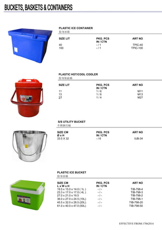 The document provides information on various plastic storage and organization products, including their sizes, packaging details, and product codes. It lists items like plastic baskets, buckets, racks, trolleys, hooks, and other household organizers, along with specifications for each item. The document appears to be a catalog or price list for these plastic products.
