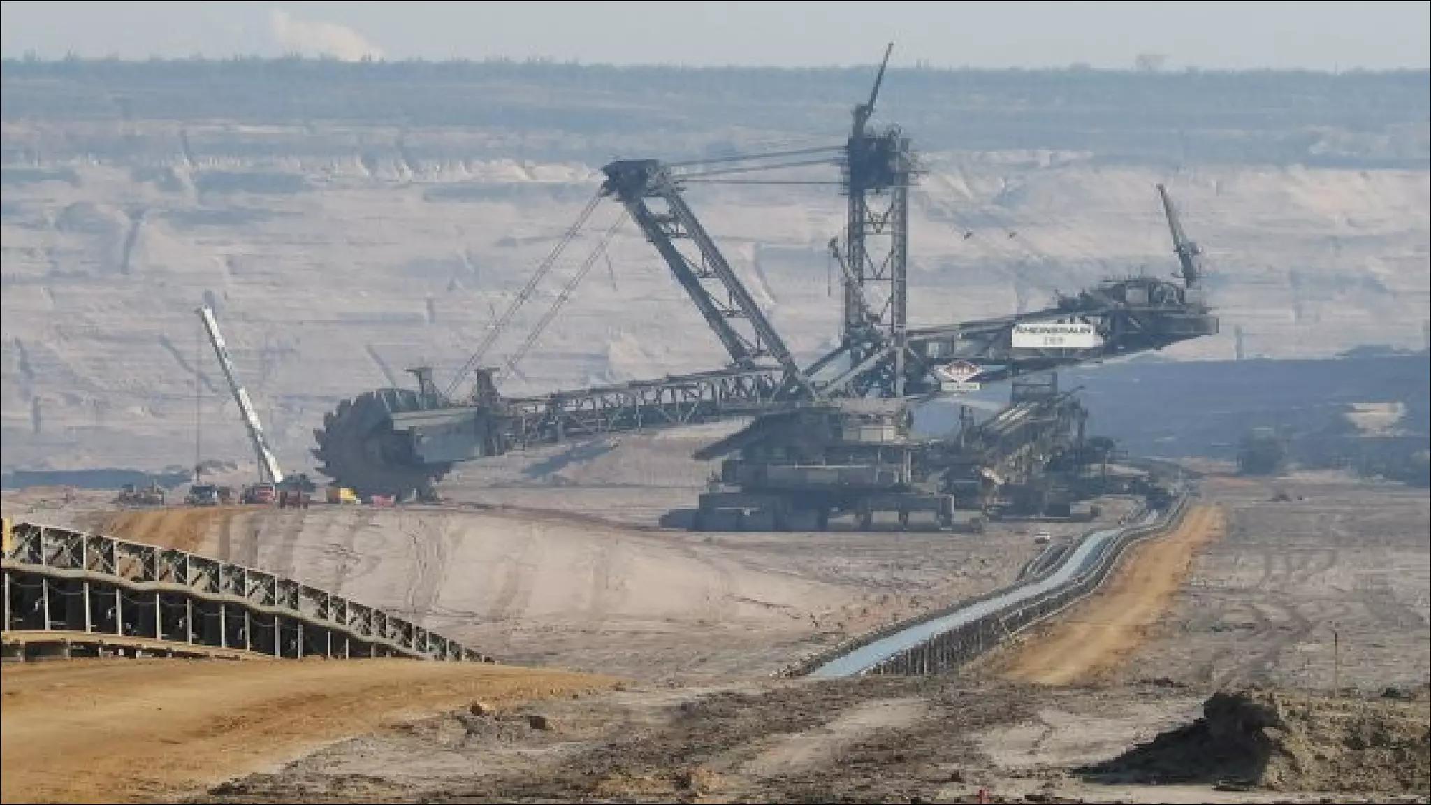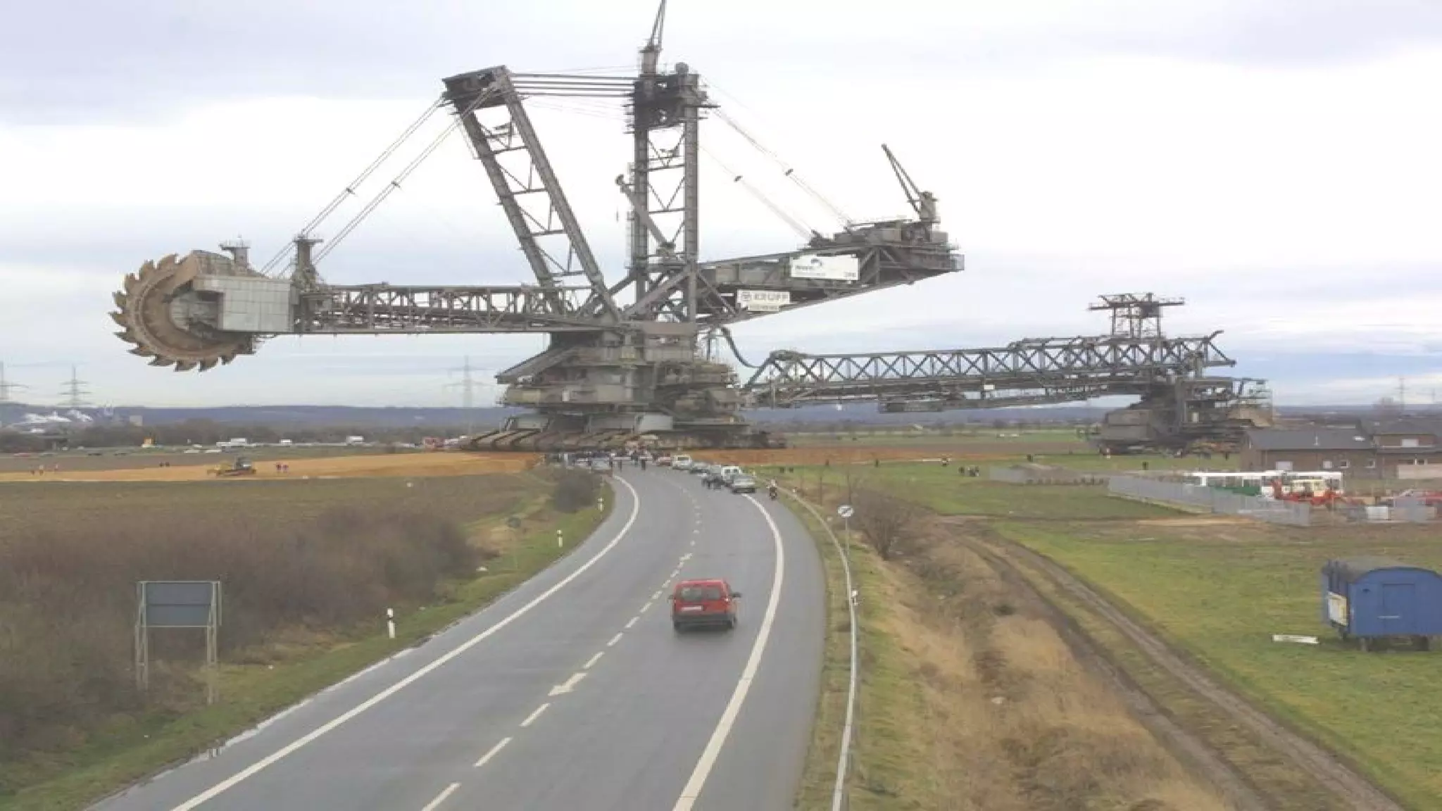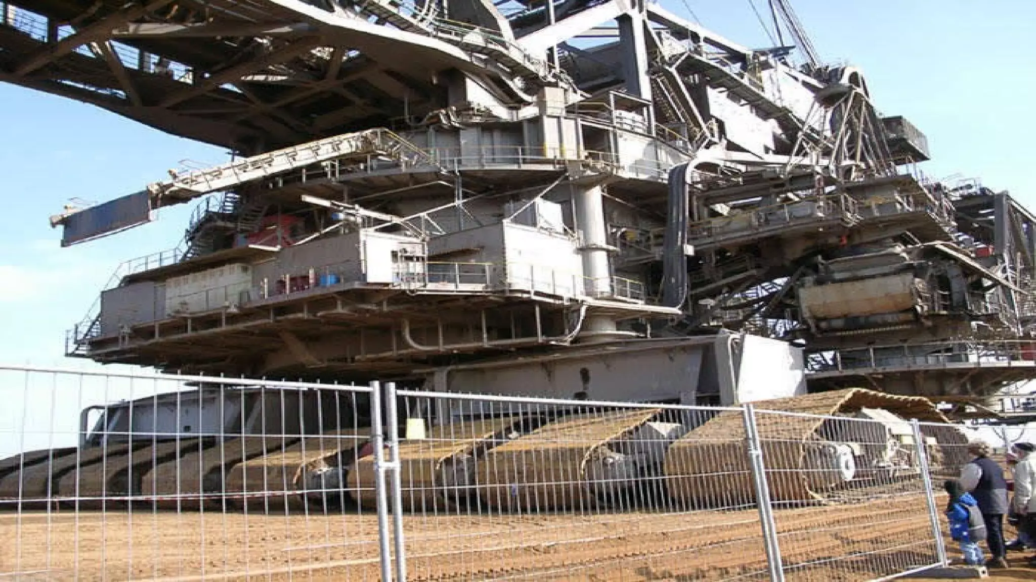 The document describes an encounter between a bucket wheel excavator and a D8R bulldozer. The bucket wheel excavator, built by German company Krupp, is the largest earth mover in the world, standing over 300 feet tall and weighing over 13,500 tons. It uses a large rotating wheel with buckets to excavate material from open-pit mines, removing over 76,000 cubic meters of material per day. The document jokes that a D8R bulldozer, weighing 32 tons, has gone missing and finds itself sitting atop the giant bucket wheel as a "toy" next to the enormous excavator.