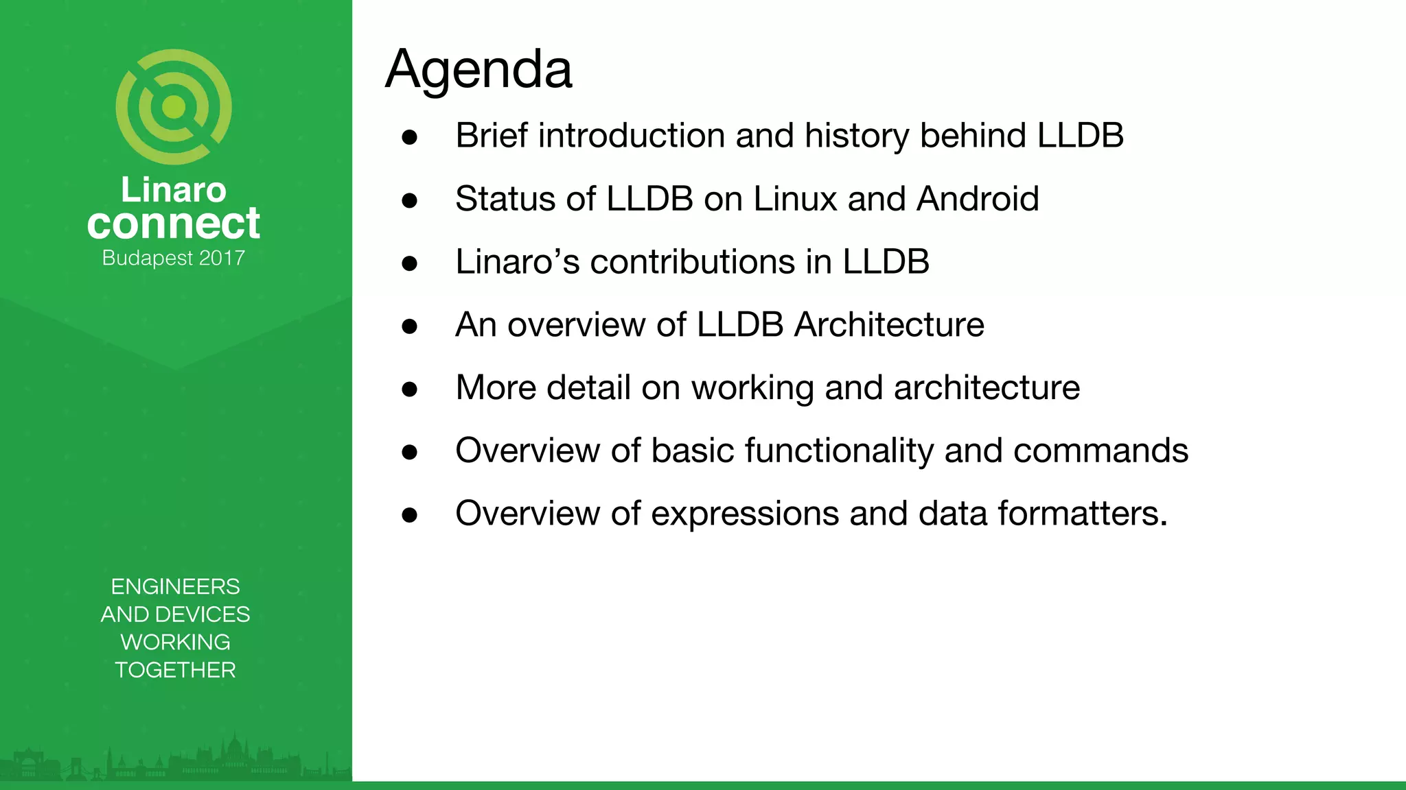 The document introduces LLDB, a high-performance source-level debugger part of the LLVM project, highlighting its architecture and functionality on Linux and Android, including support for multiple languages and target architectures. It details contributions from Linaro for ARM architectures, covering its stable features and command functionalities. Additionally, it outlines the LLDB server modes and debugging capabilities, inviting users to start using LLDB and contribute further.