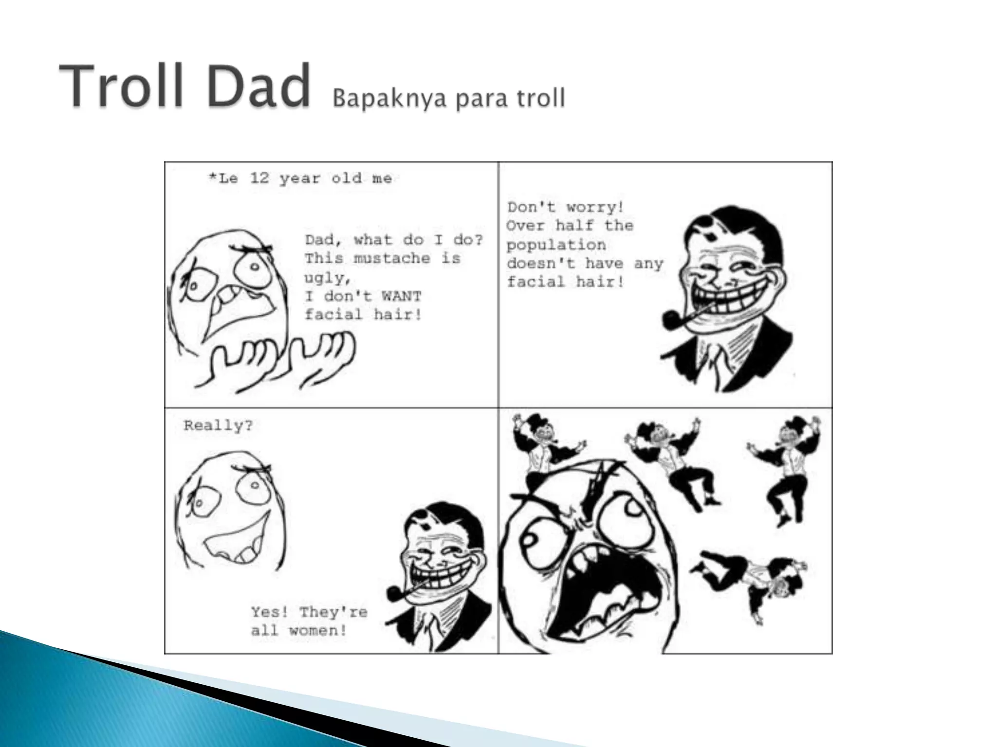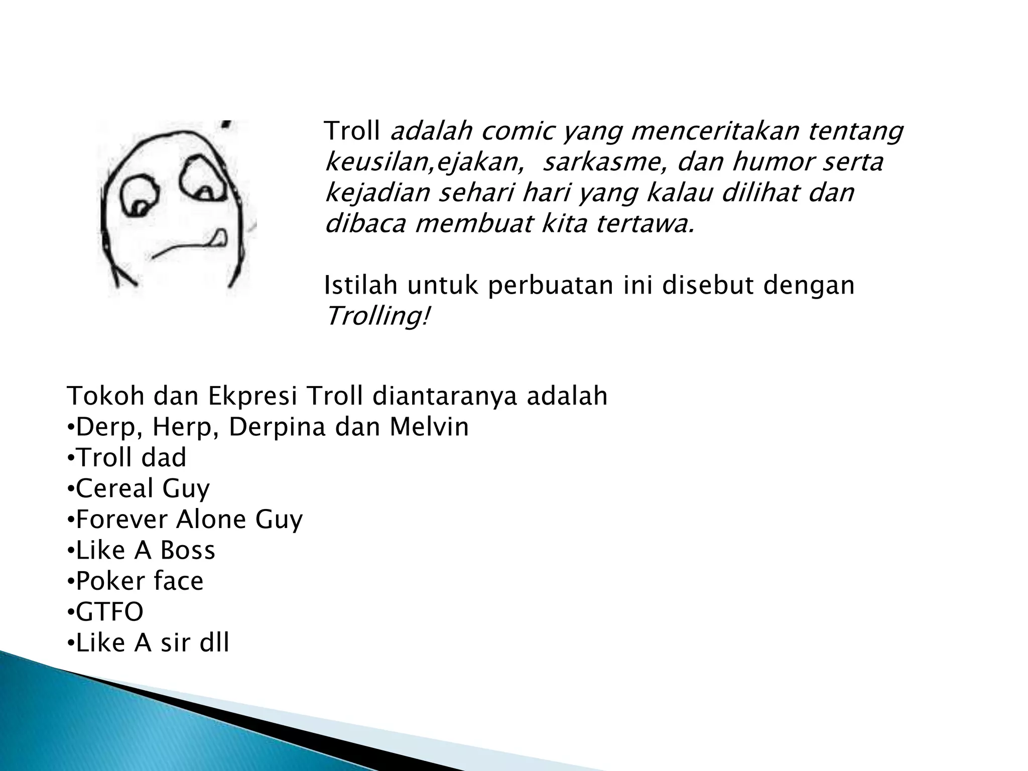 Dokumen ini membahas tentang komik yang berfokus pada humor, sarkasme, dan trolling, dengan berbagai karakter seperti derp, derpina, dan lainnya. Trolling didefinisikan sebagai tindakan keusilan yang menghibur orang lain. Selain itu, dokumen mencantumkan beberapa situs web yang terkait dengan meme dan peringatan tentang potensi ketidakproduktifan saat mengunjunginya.