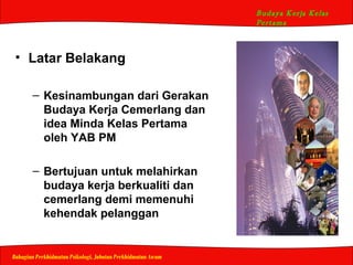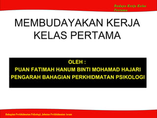 Dokumen membincangkan budaya kerja kelas pertama dalam perkhidmatan psikologi, menekankan pentingnya amalan terbaik yang memenuhi kehendak pelanggan. Ia merangkumi prinsip-prinsip seperti empati, amanah, dan integriti yang perlu dihayati oleh pekerja. Tujuannya adalah untuk meningkatkan kualiti perkhidmatan melalui peningkatan kesedaran, responsif terhadap kehendak pelanggan, dan pelaksanaan tugas dengan integriti.