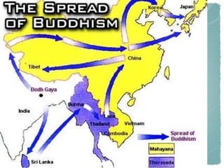 This document provides an overview of Buddhism, including its founder Siddhartha Gautama, also known as Buddha, teachings such as the Four Noble Truths and Eightfold Path, concepts like karma and rebirth, symbols, followers, and places of worship. Key facts are that Buddhism has over 350 million followers worldwide, teaches that life involves suffering and there is a path to end it through moral behavior and wisdom, and has influenced many cultures across Asia.