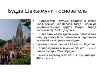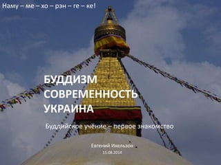 Документ исследует буддизм, его историю, ключевые учения и влияние на современность, особенно в Украине. Описываются основные концепции буддизма, включая жизнь Будды Шакьямуни, дхарму, сангху и пути к просветлению. Также рассматривается распространение буддизма по странам и его философские аспекты в контексте взаимодействия с другими религиями.