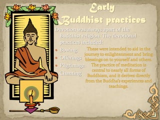 Buddhism originated in India in the 5th century BCE when Siddhartha Gautama achieved enlightenment and insight into suffering under the Bodhi tree. He taught that devotion, meditation, and moral practices like non-violence could help end suffering and reach nirvana. Central to Buddhism are the Four Noble Truths about dukkha and the Eightfold Path to its cessation. Buddhism spread from India and has over 350 million followers worldwide today in various traditions.