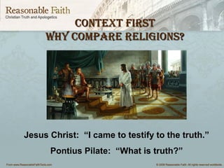 This document provides an overview of Buddhism by comparing it to Christianity as competing worldviews. It discusses the origins and key figures of Buddhism, such as Siddhartha Gautama, the four noble truths and eightfold path. The document also outlines major Buddhist concepts, practices, scriptures, and sects including Mahayana, Zen and Vajrayana. It poses questions for evaluating and engaging with Buddhism from an apologetic Christian perspective.