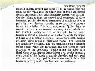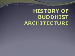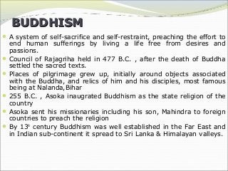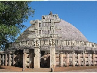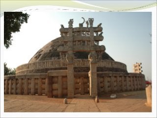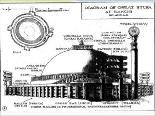 Buddhism is a religion that teaches self-sacrifice and self-restraint to end suffering by living without desires. Key sites and structures developed around relics of Buddha, including the stupa at Sanchi containing his relics. Asoka spread Buddhism across India and to other countries in the 3rd century BC. Stupas and chaityas were built to house relics, taking various forms over the centuries. The Ashokan pillar at Sarnath features carvings symbolizing the Wheel of Law. Monasteries and viharas provided living spaces for monks around stupas.