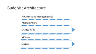 The document discusses the two major sects of Buddhism, Hinayana and Mahayana, highlighting their differences in teachings and worship. It also explores Buddhist architecture, detailing notable structures such as stupas, chaitya halls, and viharas, with specific examples like the Great Stupa at Sanchi and the architectural features of various sites. Additionally, it emphasizes the impact of Ashoka's reign on the development of Buddhist art and architecture, marking the start of the Ashokan school of architecture.