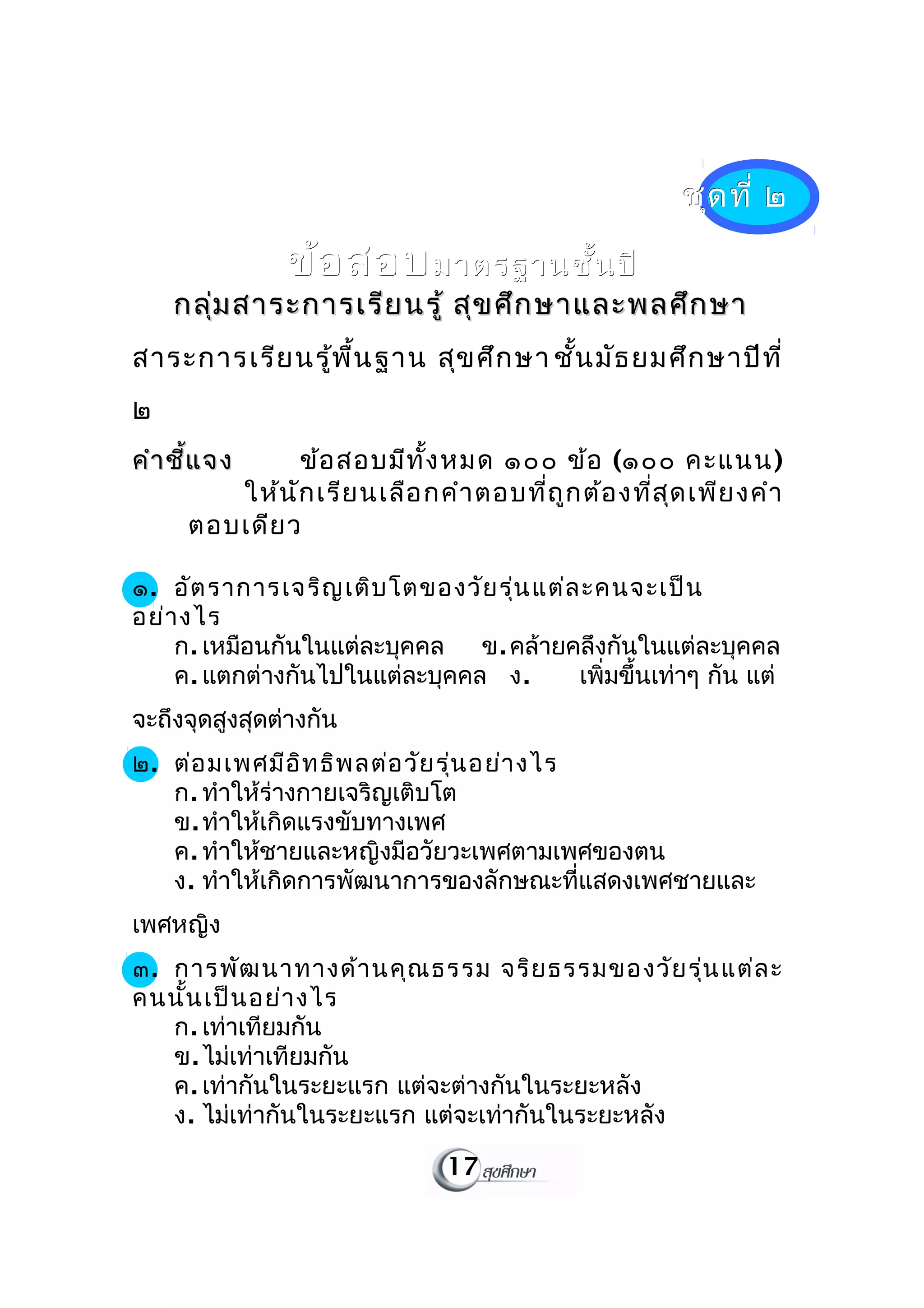 ข้อสอบ O net วิชาสุขศึกษา PDF