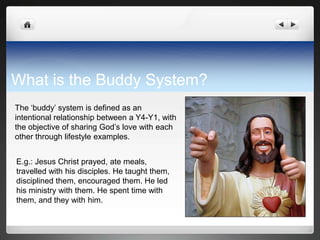 The document summarizes the Buddy System being implemented at the author's organization to foster mentoring relationships between older (Y4) and younger (Y1) members. The key aspects are: