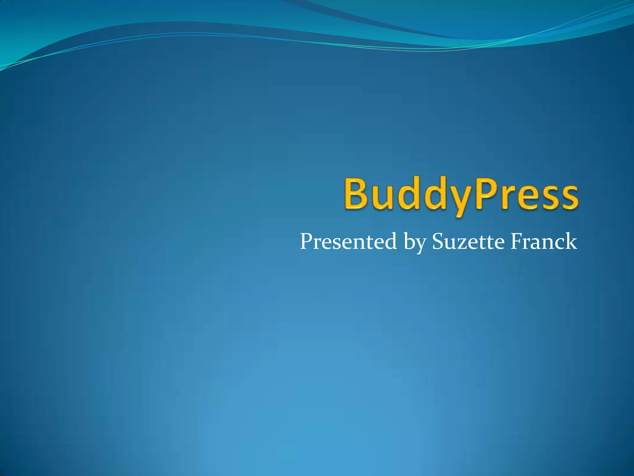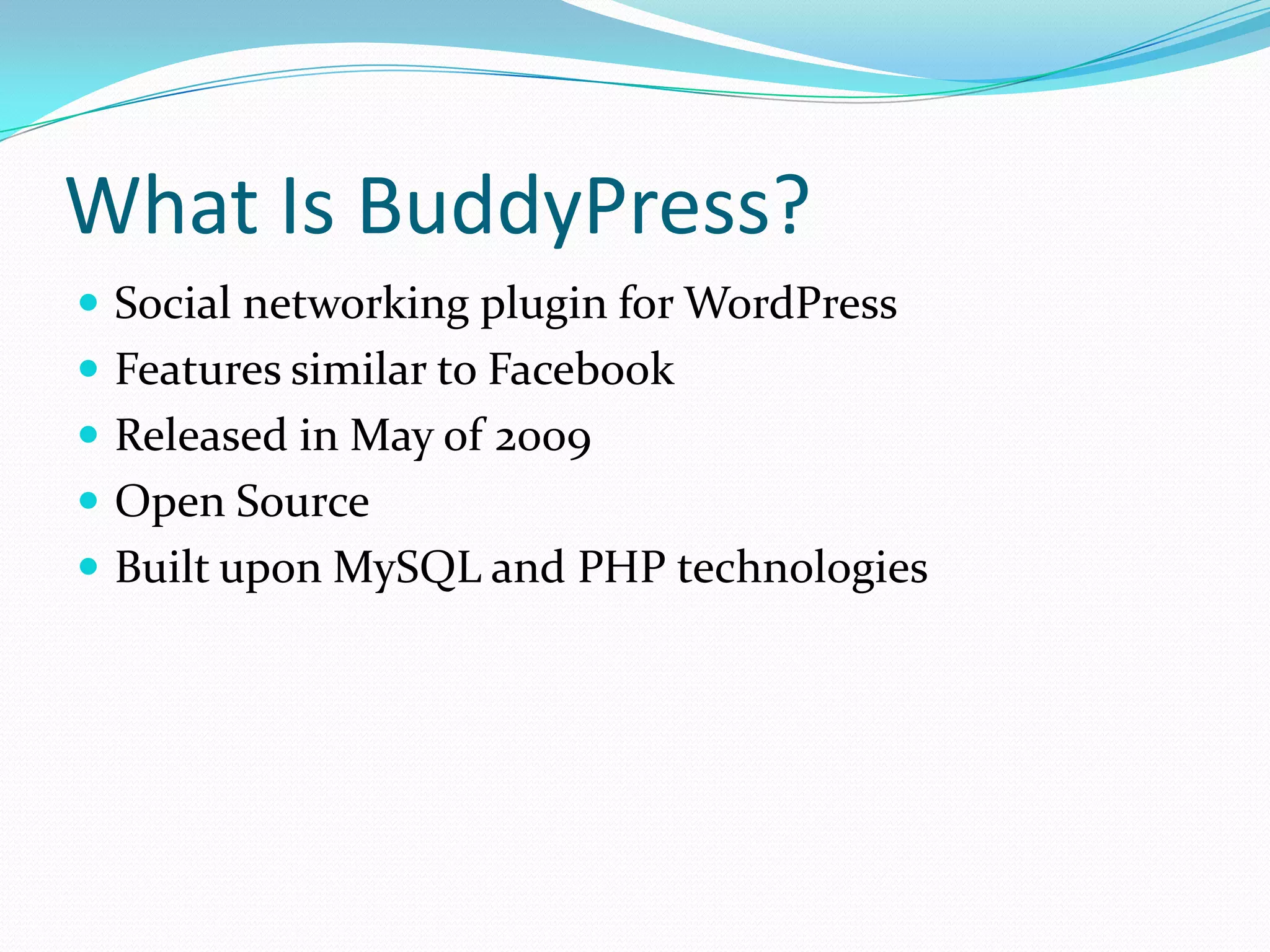 BuddyPress is a social networking plugin for WordPress that allows users to create profiles, add friends, send private messages, participate in forums and groups, and more. It has features similar to Facebook such as activity streams, status updates, and extended profiles. BuddyPress was released in 2009 and is open source software built on MySQL and PHP.