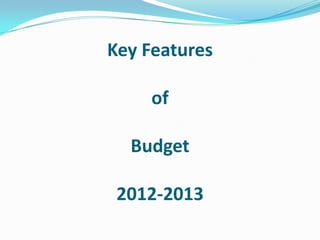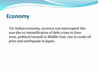 This document summarizes key aspects of the Indian government's budget for 2012-2013. It notes that GDP growth for 2011-2012 is estimated to be 6.9%, lower than the previous two years due to global economic issues. The fiscal deficit for 2012-2013 is projected to be 5.1% of GDP, an improvement from 5.9% the previous year. Taxes are adjusted with new income tax slabs and exemptions for senior citizens, health insurance, and capital gains from property sale. Disinvestment targets are set at 30,000 crore rupees. Efforts to reform taxation include a direct tax code and goods and services tax.