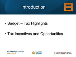 The 2012 budget outlines key tax changes including the increase of the Universal Social Charge exemption and the continuation of the 12.5% corporation tax rate. Personal tax rates remain unchanged while indirect taxes such as VAT and carbon taxes see increases; capital taxes experience adjustments including a rise in CGT rates and a reduction in CAT thresholds. Other highlights include a reduced employer rebate for statutory redundancy and updates to property reliefs and pension regulations.