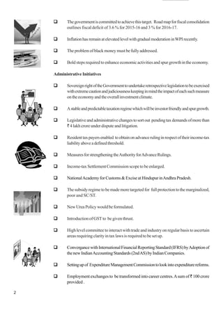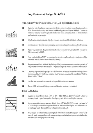 The document summarizes the current economic situation in India and key initiatives in the Union Budget of 2014-2015 to address economic challenges and promote growth. It outlines steps to reduce fiscal and current account deficits, boost manufacturing and infrastructure sectors, increase tax revenues, and revive growth. It provides details on initiatives for agriculture, education, health, rural development, women and child welfare, and industries among others. The budget aims to achieve macroeconomic stability and a growth rate of 7-8% over the next 3-4 years.