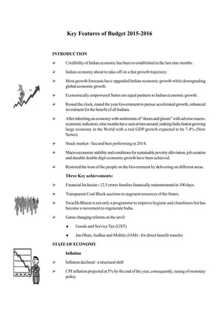 The document provides an overview of the key features of the Indian government's Budget for 2015-2016. It discusses the state of the Indian economy, challenges, and the government's plans and targets in areas such as agriculture, infrastructure, financial markets, investment, taxation, and social programs. The budget estimates total expenditure of 17.77 trillion rupees, with a fiscal deficit target of 3.9% of GDP. It aims to continue economic growth while addressing issues like agricultural stress, infrastructure investment, and maintaining fiscal discipline.