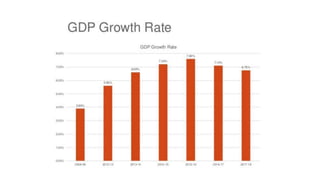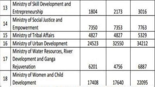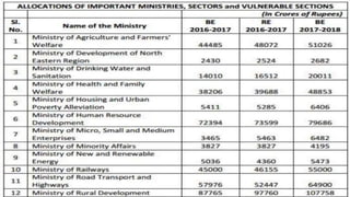 This document provides an overview of the Indian budget for 2017-2018. It includes details of revenue and expenditure estimates for 2015-2016, 2016-2017, and projections for 2017-2018. Revenue estimates are projected to increase to Rs. 1515771 crores in 2017-2018. Expenditure on schemes is projected to increase to Rs. 945078 crores in 2017-2018. The fiscal deficit is projected to decrease to 3.2% of GDP for 2017-2018. The budget aims to boost the rural economy, digital economy, and FMCG sector through increased capital expenditures and tax reductions for small companies. However, it is criticized for a lack of support for manufacturing and scientific research.