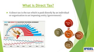 Group 6 presented information on direct taxes in India. The group members are Snehal Nemane, Sayli Mahalle, Shruti Adyalkar, and Vrushabh Agarwal. Direct taxes are taxes paid directly by individuals and organizations to the government. Major changes in direct taxes included no changes to income tax rates but a new 4% health and education cess. Corporate tax rates were reduced to 25% for companies with turnover less than Rs. 250 crore. Long-term capital gains on equity shares and funds will be taxed at 10%.