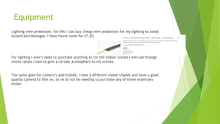 This document outlines the budget for a film project. It will have a very low budget as most of the equipment is already owned, including cameras, tripods, and indoor lighting. The actors are friends who will work without pay. The only potential costs are £7.20 for wire protectors, travel expenses up to £10, and £3.53 for fake blood and a notebook. The total budget should be around £15 to £25.