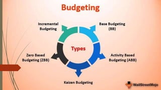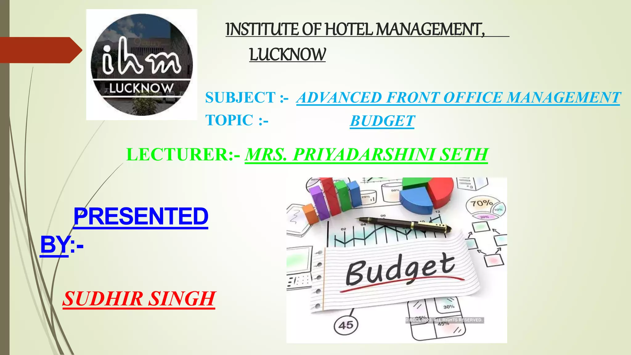 The document discusses different types of budgets used in hotel management like operating budgets, capital budgets, and departmental budgets. It explains that a budget is a business plan expressed in monetary or quantitative terms that outlines expected expenditures based on anticipated revenues. Developing a budget is an important long term planning process that sets goals, enhances management control, and enables optimal use of resources. It also highlights advantages like eliminating uncertainty, facilitating coordination between departments, and serving as a benchmark for performance. Potential disadvantages include budgets never being completely accurate and not guaranteeing successful implementation.