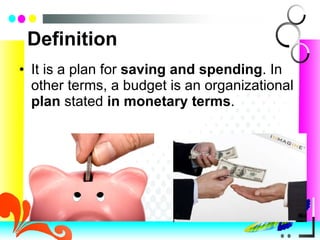 The document discusses various types of budgets including personal/family budgets, sales budgets, production budgets, cash flow/cash budgets, marketing budgets, project budgets, and revenue and expenditure budgets. It provides examples of what would be included in each type of budget and explains their purposes. Common budgeting mistakes are also outlined such as using too much cash, being too strict, and spending unexpected extras rather than saving them.