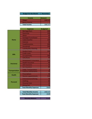 The document summarizes a person's budget for the month of November. It lists total income of $2,682.67 which includes wages. Total monthly expenses are budgeted at $2,649, including $450 for mortgage/rent, $150 for electricity, and $250 for student loans. This results in a monthly balance of $33.67.