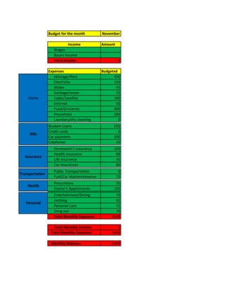 This document is a monthly budget for November. It shows $0 in total income for the month and $2649 in total budgeted expenses. The largest expenses are $450 for mortgage/rent, $300 for car payments, $250 for student loans, and $150 each for electricity, homeowners insurance, and doctor's appointments. The budget is $2649 in the negative for the month.