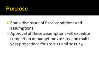 The document provides fiscal assumptions and projections for a school district's budget from 2011-12 through 2013-14. It includes assumptions about revenues, expenditures, staffing levels, and other factors. Charts show historical and projected revenues and expenditures. The district is facing reductions in state funding and increasing costs, and has made staffing and program reductions in response. Approval of the assumptions would allow completing multi-year budget projections.