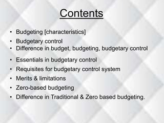 The document discusses budgeting and budgetary control, defining budgeting as a pre-determined management policy and budgetary control as a system that utilizes budgets for planning and controlling operations. It outlines the characteristics of effective budgeting, essentials for budgetary control, and the difference between traditional and zero-based budgeting. Additionally, it highlights the advantages and limitations of budgetary control, emphasizing its role in performance measurement and resource allocation.