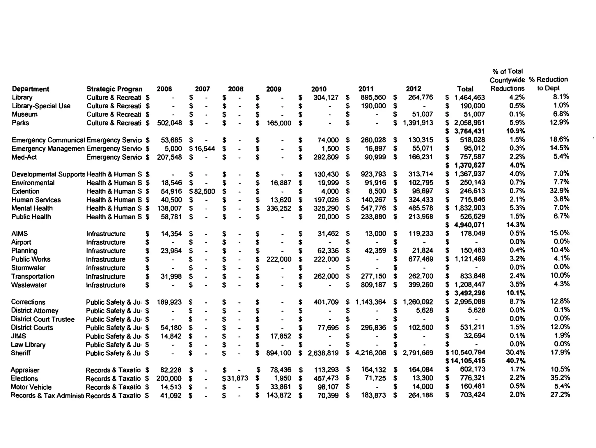 The document provides budget information for various county departments from 2006-2012. It shows the budget amounts and percentages of the total countywide budget for each department and year. It also calculates the percentage reduction for each department from 2006-2012. The largest portions of the countywide budget went to Public Safety & Justice departments (40.7%), Health & Human Services departments (14.3%), and Support Services departments (13%). The Sheriff's department received the largest amount at $10.5 million (30.4% of the total) while Corrections was the next highest at $3 million (8.7%).