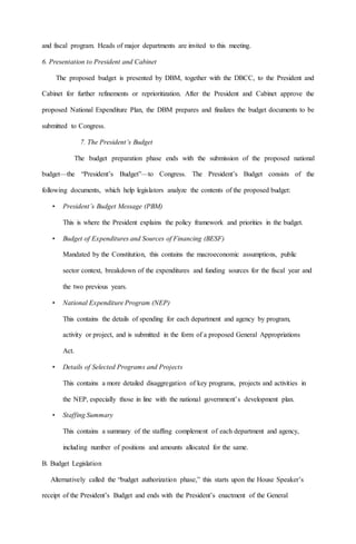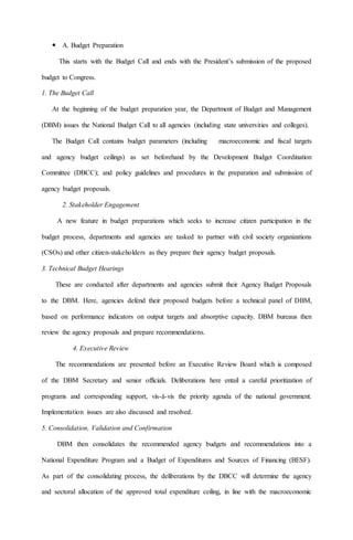 The budget preparation process begins with a budget call issued by the Department of Budget and Management to government agencies. Agencies then prepare their budget proposals which are reviewed through technical hearings and an executive review process. The budgets are then consolidated into a proposed national budget that is presented to the President and Cabinet for approval. This proposed budget is then submitted to Congress, starting the budget legislation phase where Congress deliberates on and passes the General Appropriations Act. Once enacted, the budget execution phase begins as government agencies implement programs and projects using funds released based on the allotment and cash programs. Throughout this process, the Department of Budget and Management monitors budget accountability to ensure efficient and effective use of public funds.