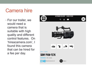 The document provides a budget breakdown for the costs of producing a trailer. It estimates the professional costs of camera hire at £159 for hiring a camera and tripod for one day from hireacamera.com. Cast and crew costs are estimated at £1848.53 to pay three actors £299.51 per day each and two directors/producers £475 each for one day of filming. Costume costs total £380.95 for outfits for three actors. As filming was on their own property, there was no cost for the set location. The total estimated budget for the trailer production is £2988.48.
