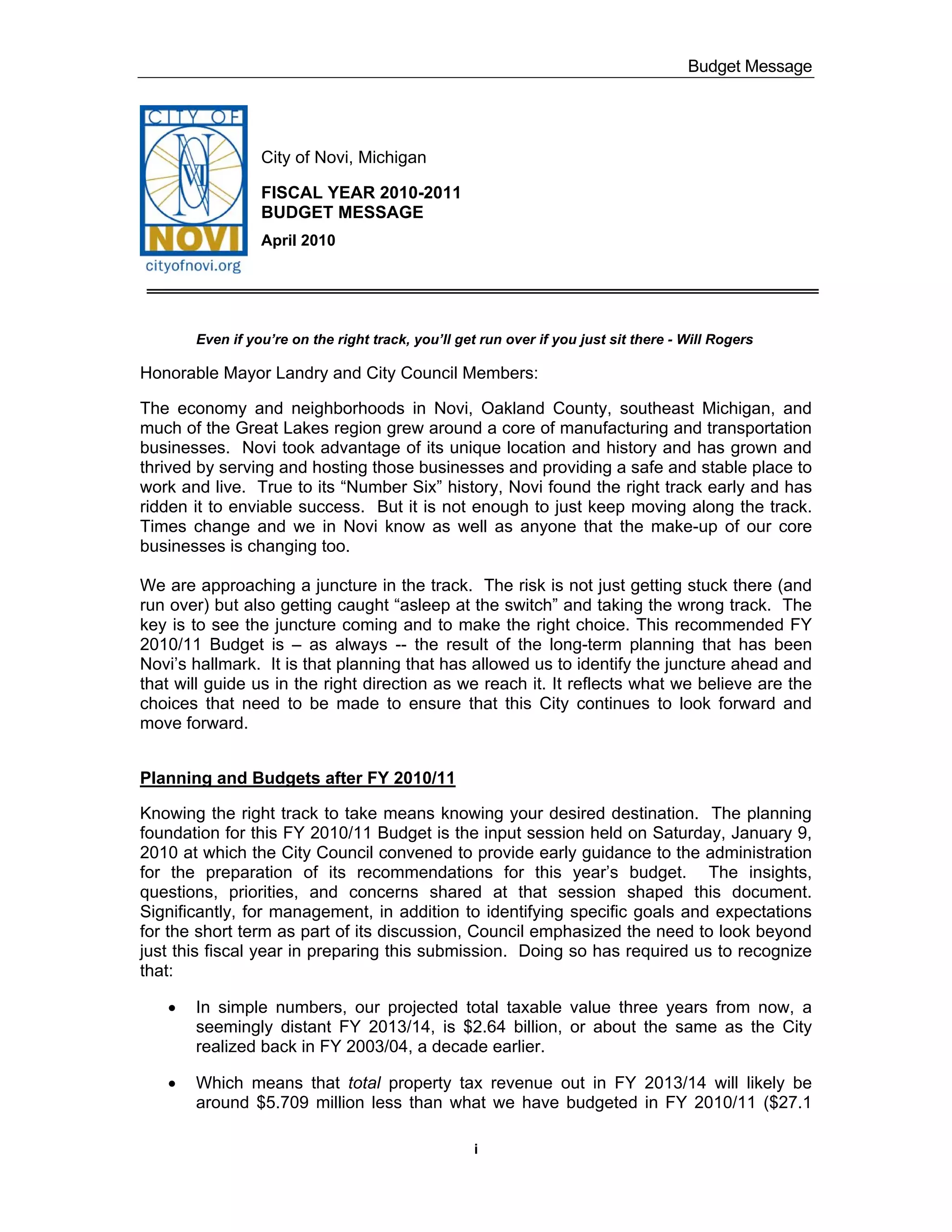 This document provides a budget message for the City of Novi, Michigan for fiscal year 2010-2011. It discusses how the city has historically relied on manufacturing and transportation businesses but must now adapt to changing economic conditions. It outlines cost reductions made for the upcoming budget, including staff reductions, benefit changes, and other efficiency measures. The message emphasizes the need to plan long-term through fiscal analysis and budgeting conservatively to ensure financial stability in the face of declining revenues.