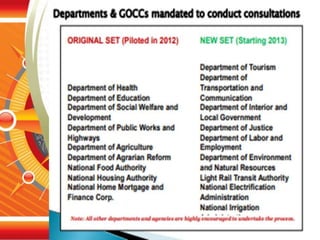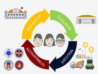 The document outlines the Philippine government's budgetary processes, highlighting the critical role of government budgeting in allocating financial resources to achieve economic and social goals. It details the legal basis for budget preparation and approval, including the roles of various government bodies such as the Department of Budget and Management and the Development Budget Coordination Council. Additionally, it discusses the phases of budget execution, control, and accountability, emphasizing the importance of stakeholder participation, performance measurement, and auditing in ensuring efficient fund utilization.