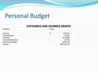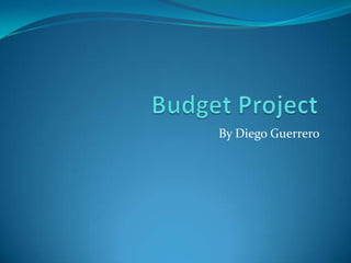 The document outlines Diego Guerrero's personal budget, including expenses in categories like housing, transportation, and savings. Housing accounts for 29% of expenses at $1,937.69 per month. Transportation is 11% of the budget at $753.87 monthly. Savings make up the largest portion at 31% or $2,050.22 per month. The document also provides details on Diego's home, vehicle, and furniture purchases. It concludes by outlining Diego's goals to attend Cal Tech, work for a private space company in Florida, own a large home, and retire happily pursuing hobbies after earning $100,000 per year.
