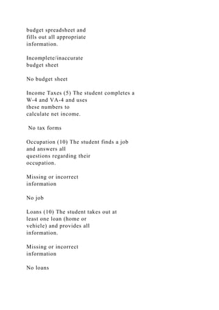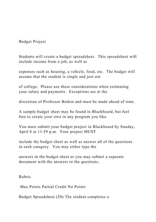 Students are required to create a budget spreadsheet that includes income and expenses related to living independently after college. The project involves estimating salaries, filling out tax forms, detailing loans for housing or vehicles, and providing comprehensive answers to various financial categories, culminating in a conclusion about what they learned. Submissions must be made by April 8, and extra credit is available for selecting a bank and detailing services.